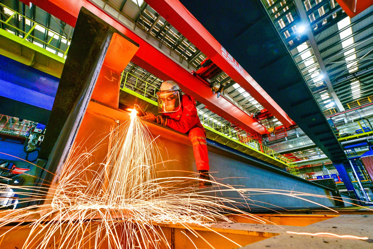 A worker conduct a gas cutting operation at an offshore oil and gas platform, in Binhai New Area, Tianjin, on Jan 19.