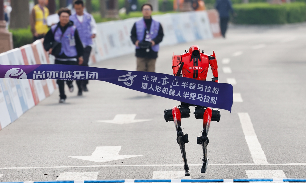 The Robotics D1 humanoid robot, developed by Chinese smartphone maker HONOR and nicknamed "Lightning," crosses the finish line in 48 minutes and 19 seconds in the remote-control category at the second Humanoid Robot Half Marathon in Beijing on April 19, 2026.