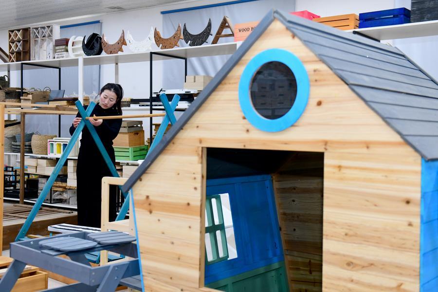 A staff member assembles a pet home at the Caoxian Penghui Crafts Co., Ltd. in Caoxian County, east China's Shandong Province, Nov. 28, 2025.