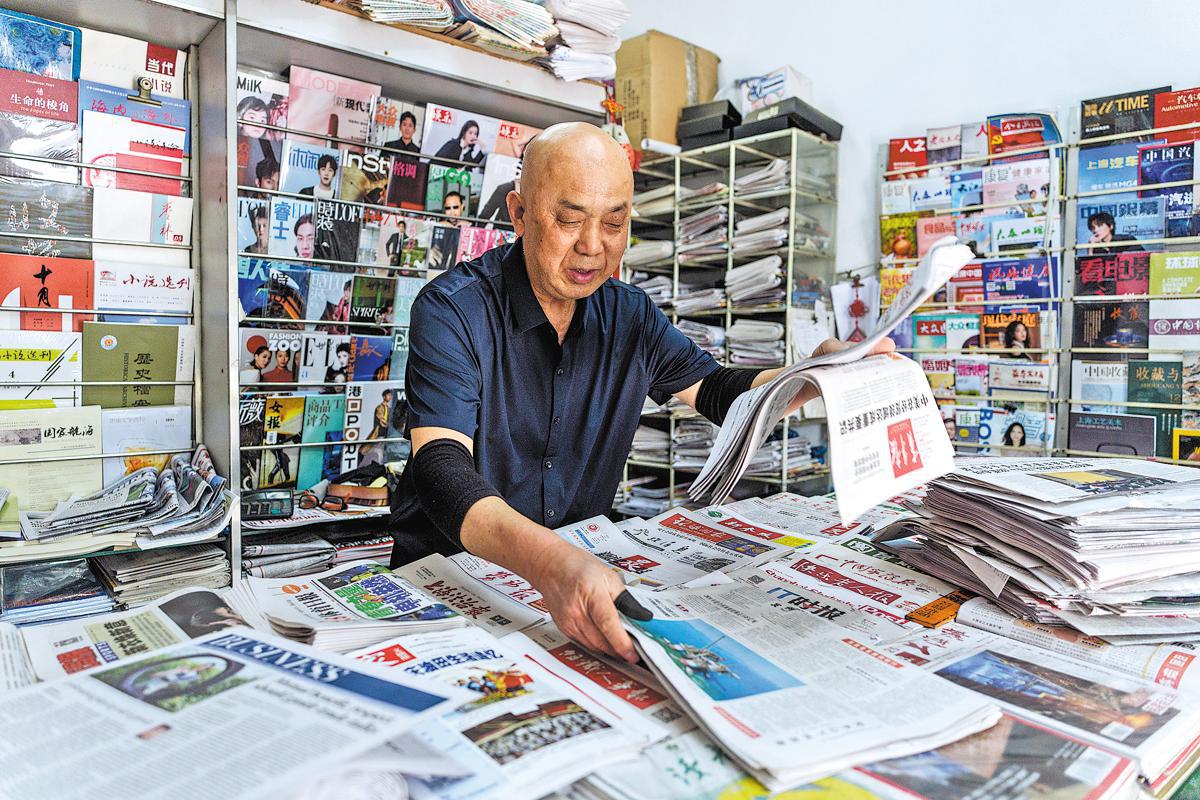 Jiang Jun organizes different newspapers at the newsstand's old location at Wusong Road in Shanghai's Hongkou district last year. ......