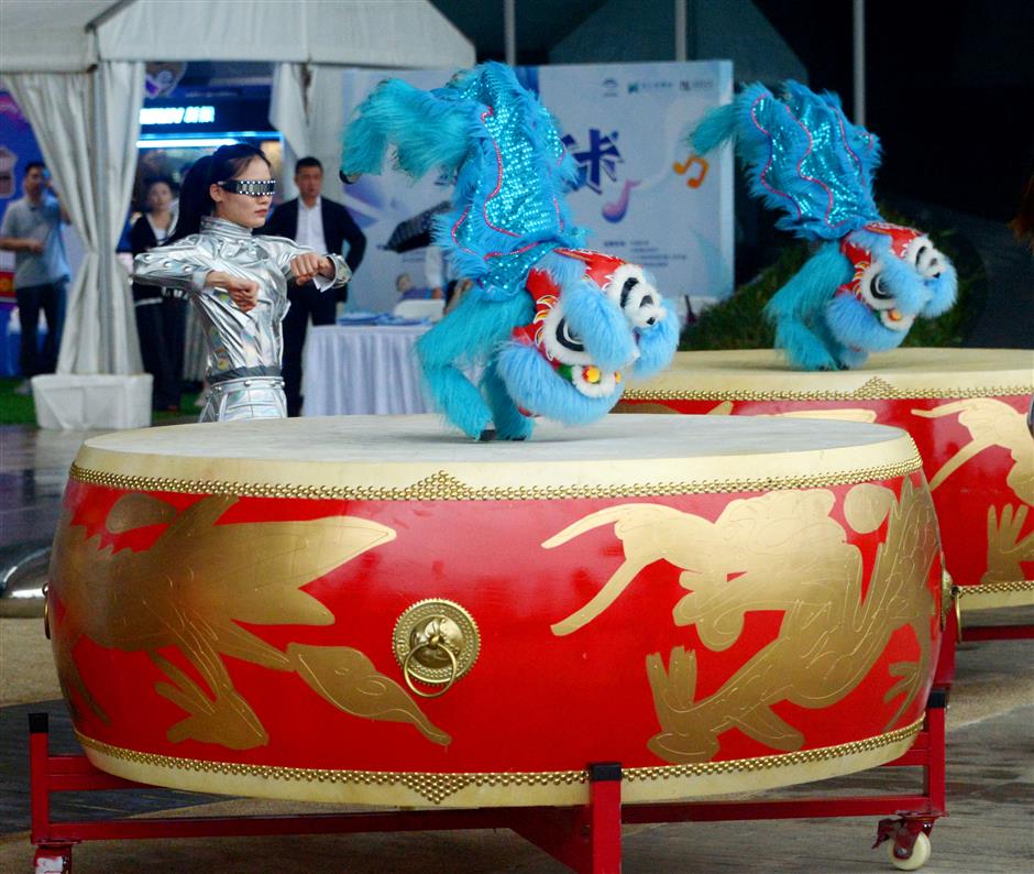 Robot dogs dressed as lions beat drums at Nanda Smart City, opening the Baoshan section of the 2025 Shanghai Urban Space Art Season.