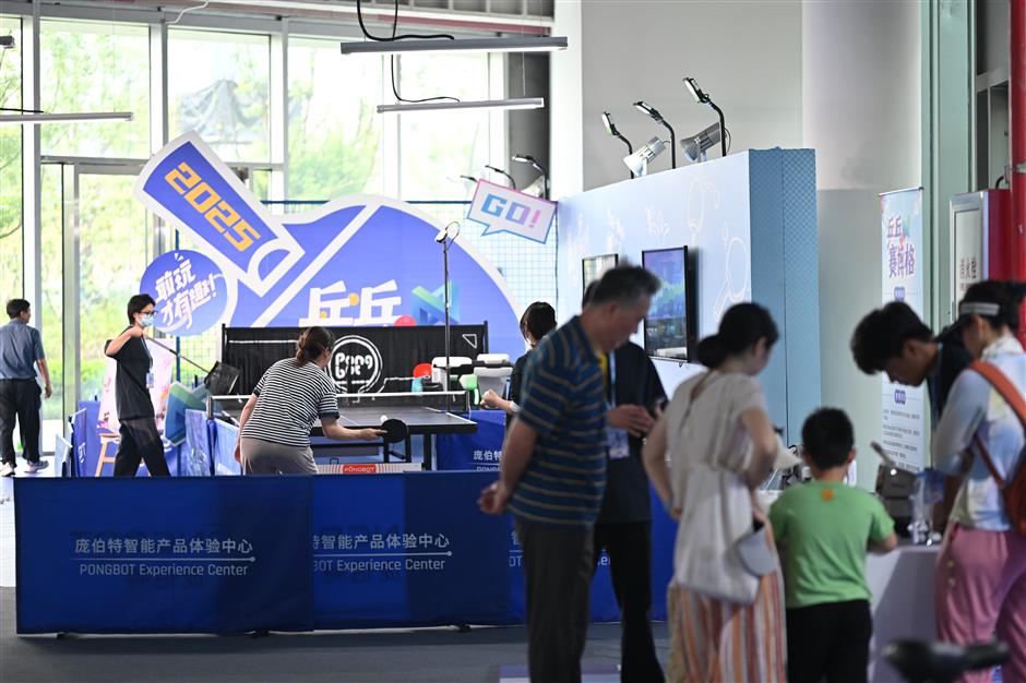 Visitors play table tennis with robots at the Nanda Smart City Urban Space Art Season exhibition on Wednesday.