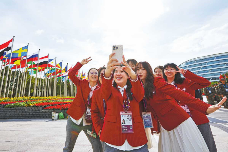 Volunteers of the upcoming 8th China International Import Expo take a selfie at the National Exhibition and Convention Center in Shanghai on Nov 3.