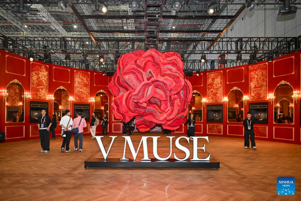 An exhibitor (R) introduces handmade carpets to a visitor at the eighth China International Import Expo (CIIE) in east China's Shanghai, Nov. 5, 2025. Featuring the largest exhibition area in its history and a record high number of exhibitors, the eighth China International Import Expo (CIIE), with the theme of "New Era, Shared Future," has attracted 4,108 overseas exhibitors from 155 countries, regions and international organizations -- with the total exhibition area exceeding 430,000 square meters. (Xinhua/Liu Wenhui)