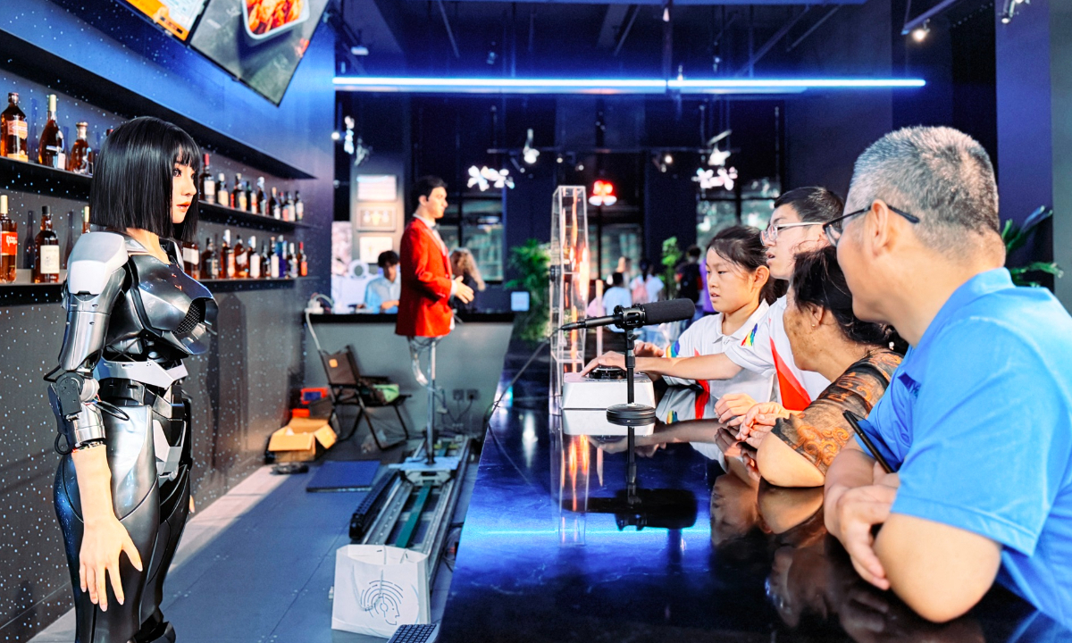 Humanoid robot Xiao Qi (left) answers customer questions at the opening of Beijing's first robot restaurant on August 23, 2025.
