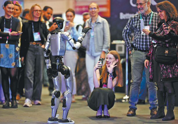 Attendees interact with a robot at the Unitree booth during day two of Web Summit 2025 at the MEO Arena in Lisbon, Portugal, on Nov 12.