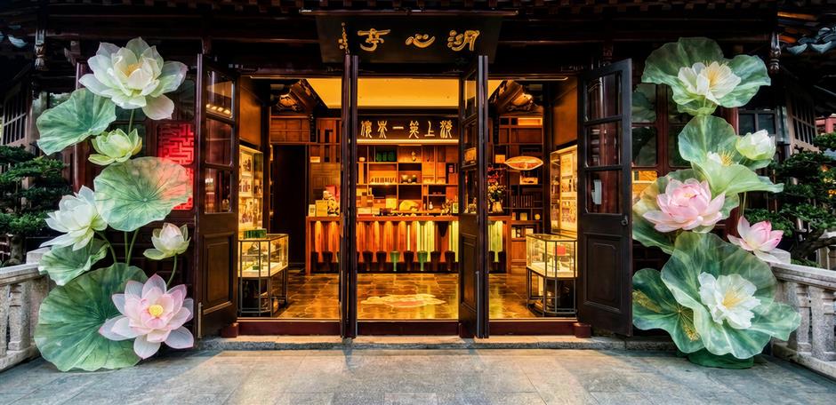 Giant floral decorations frame the windows of the historic Mid-lake Pavilion in Yuyuan Garden Malls.