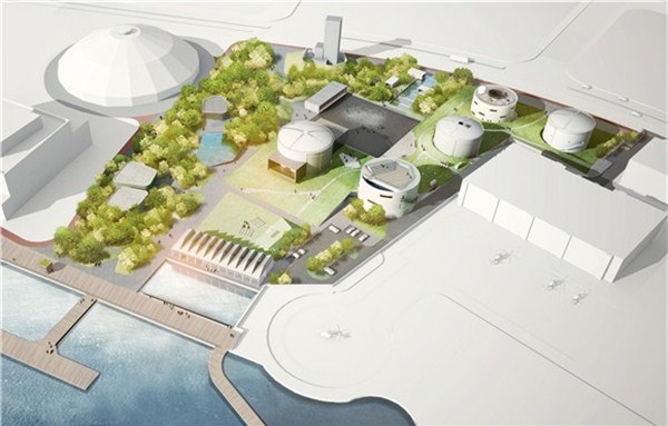 Cranes are removing the covers of the huge tanks so the structures can be converted into exhibition halls, plazas, gardens, book stores, education centers and restaurants