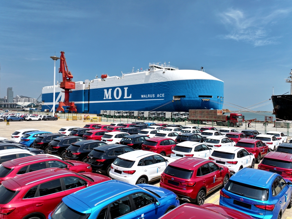 Vehicles from SAIC Motor await loading onto a roll-on/roll-off (ro-ro) ship at a port in Lianyungang, Jiangsu province. The automaker retained its position as the second-ranked enterprise on Shanghai's 2025 list of top 100 enterprises.