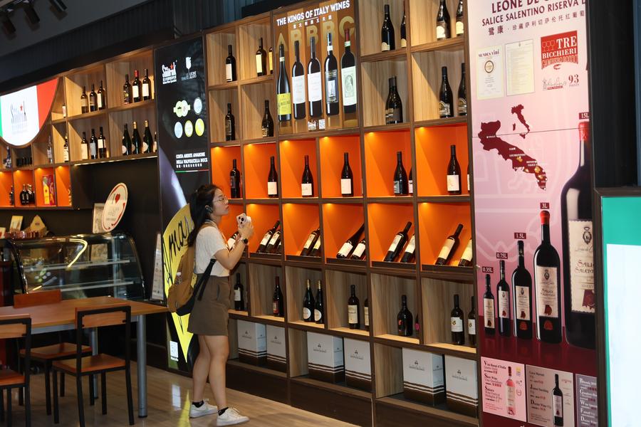 A visitor views wines displayed at the Hongqiao Import Commodities Expo and Trade Center in Shanghai, east China, Sept. 9, 2025. The Hongqiao Import Commodities Expo and Trade Center, also known as Hongqiao Pinhui, serves as a year-round platform that extends the China International Import Expo (CIIE) service to exhibit and trade imported products all year.