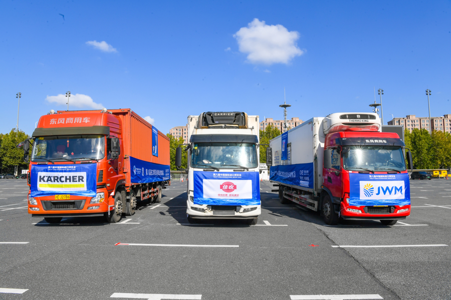 Three trucks carrying the first batch of exhibits to enter the venue for the 8th China International Import Expo arrive at the north square of the NECC on Oct 23, 2025.
