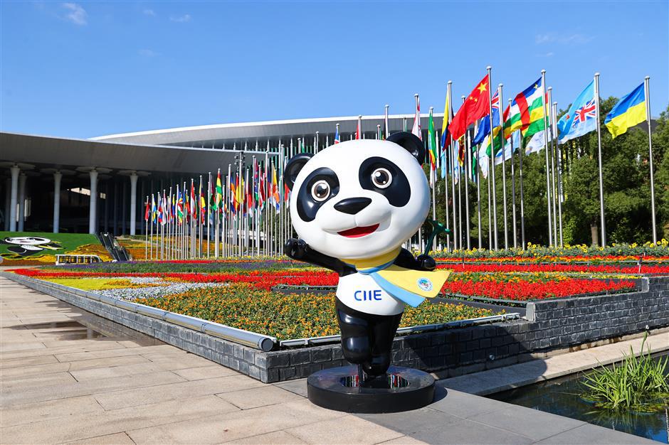 The CIIE mascot Jinbao is seen at the gate of the NECC (Shanghai).