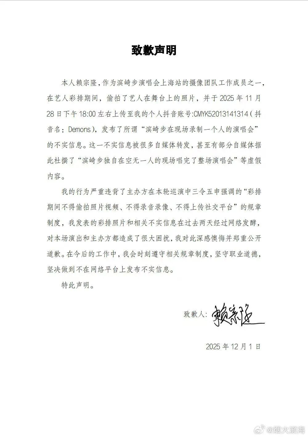 A videographer working on Ayumi Hamasaki's Shanghai concert has issued a public apology after secretly filming backstage and posting the footage online, triggering viral rumors that the Japanese pop star performed "to an empty arena."