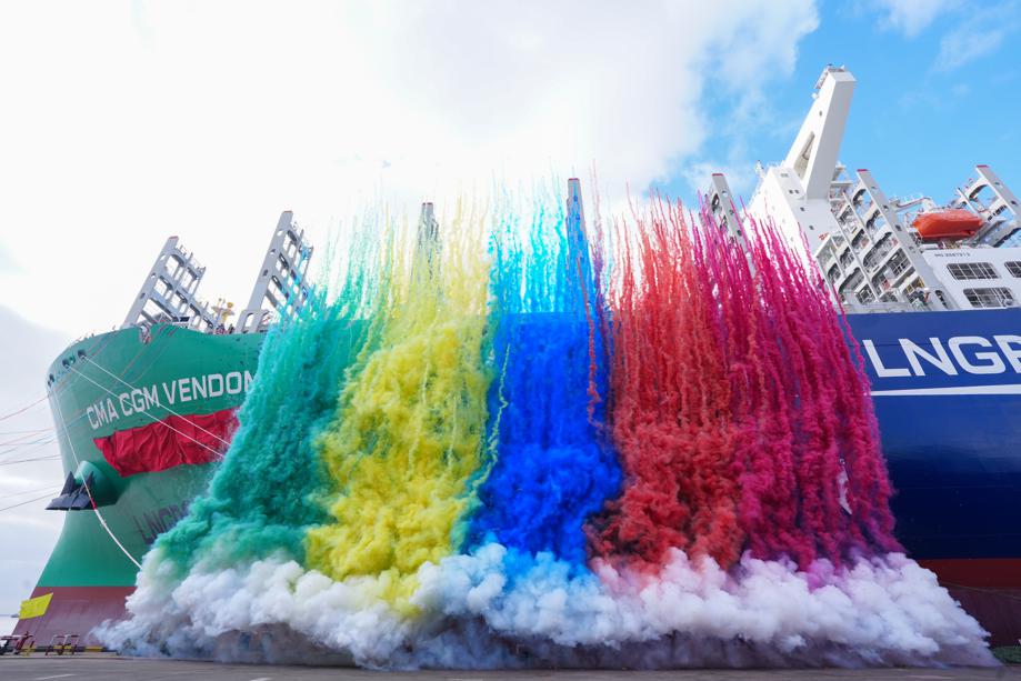 Measuring 399 meters in length and 61.3 meters in width, the dual-fuel powered container ship reduces emissions of sulphur and fine particles by 99 percent, nitrogen oxides by 85 percent, and carbon dioxide by about 20 percent compared with conventional vessels.