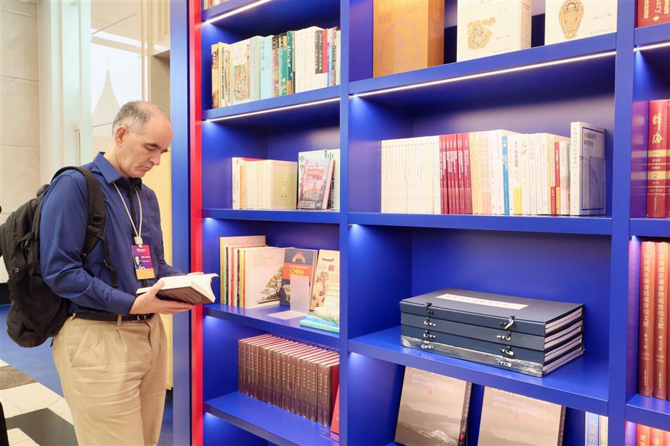 A foreign scholar browses books during the 2nd World Conference on China Studies in Shanghai.