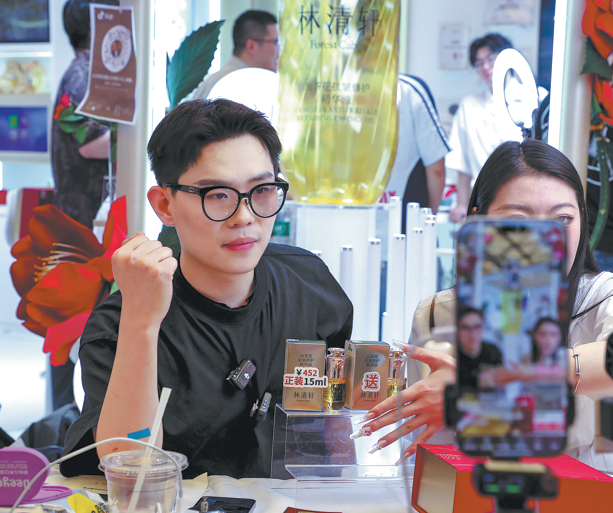 Merchants promote Lin Qingxuan's products through livestreaming in Shanghai on May 14. Shanghai Forest Cabin Cosmetics Group, or Lin Qingxuan, a leading brand in China's domestic skincare market, has filed its IPO prospectus and plans to go public in Hong Kong, amid fierce competition in the skincare oil market.
