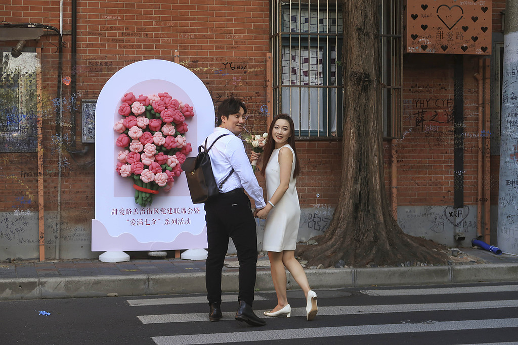 A newly married couple take photos at a street in Shanghai, on Aug 29, 2025. Shanghai recorded more than 175,000 marriage and divorce registrations, including more than 125,000 couples for marriage, last year, the Shanghai Civil Affairs Bureau said on Monday.
