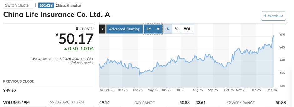 China Life Insurance was the worst performer in its industry on Chinese mainland markets, with a share price gain of only 8.5 percent, lagging the18.4 percent increase in the Shanghai Composite Index.