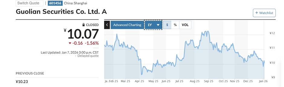 Wuxi-based Guolian Minsheng Securities suffered a 22.5 percent decline in its share price in 2025 after the merger of Guolian Securities and Minsheng Securities in a 29.5 billion yuan (US$4 billion) deal was completed at the start of the year. Analysts suggested teething problems combining the operations of both firms.
